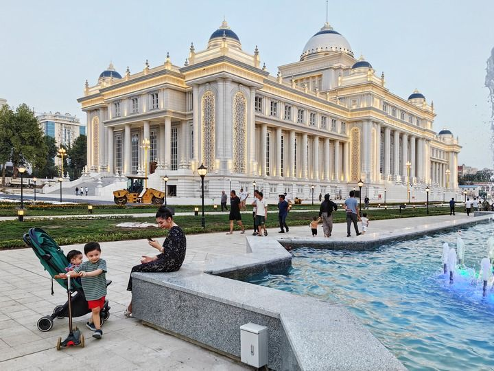 2024年6月29日,在塔吉克斯坦首都杜尚别,人们在塔吉克斯坦议会大楼前休闲。新华社记者 申宏 摄