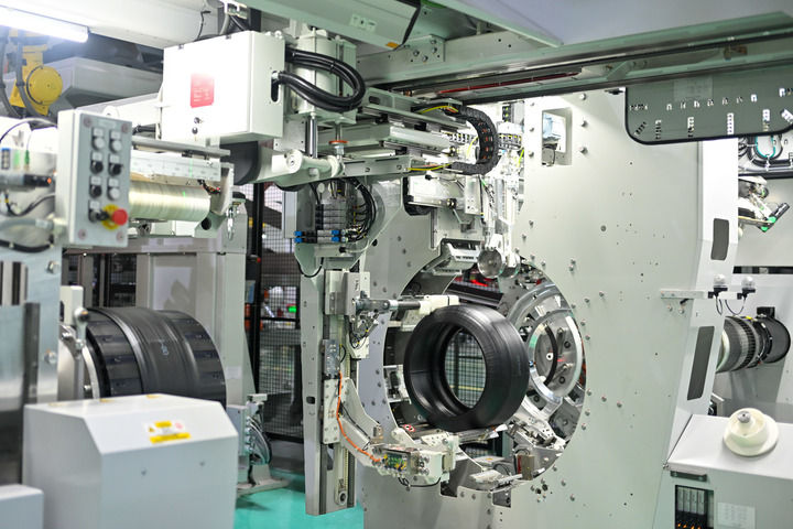 这是2024年7月26日拍摄的浙江杭州中策钱塘实业有限公司轮胎数字工厂车间内的自动化轮胎生产线。新华社记者 江汉 摄