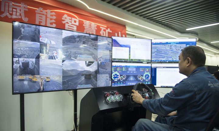 2024年4月11日,技术人员在位于四川省攀枝花市的攀钢矿业朱兰铁矿智慧管控中心远程操控无人自动驾驶矿车。新华社记者 张豪夫 摄